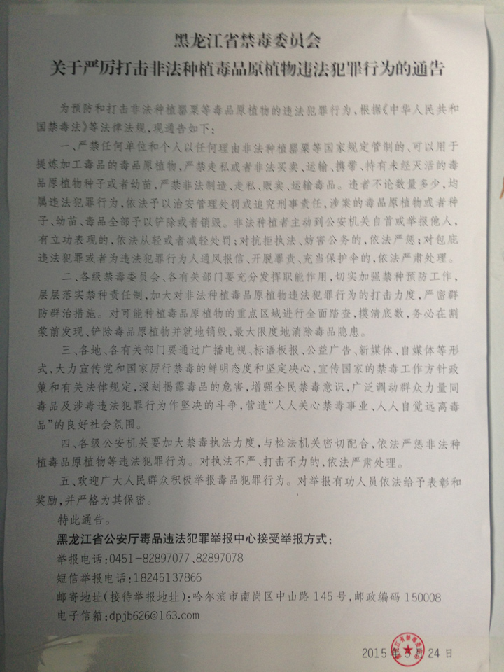 黑龙江省禁毒委员会关于严厉打击非法种植毒品原植物违法犯罪行为的通告